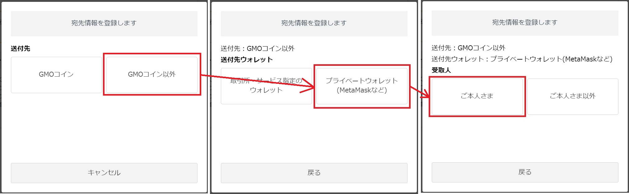 ▼今回はPhantomWalletに送付するので、GMOコイン以外 > プライベートウォレット ご本人さま を選択します。