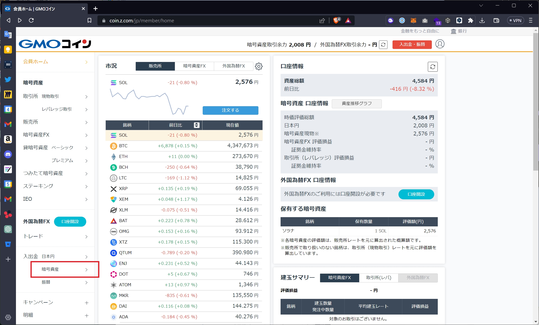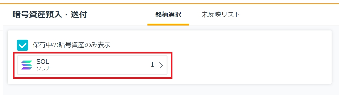 ▼入出金>暗号資産をクリックして送金する暗号資産をクリックします。