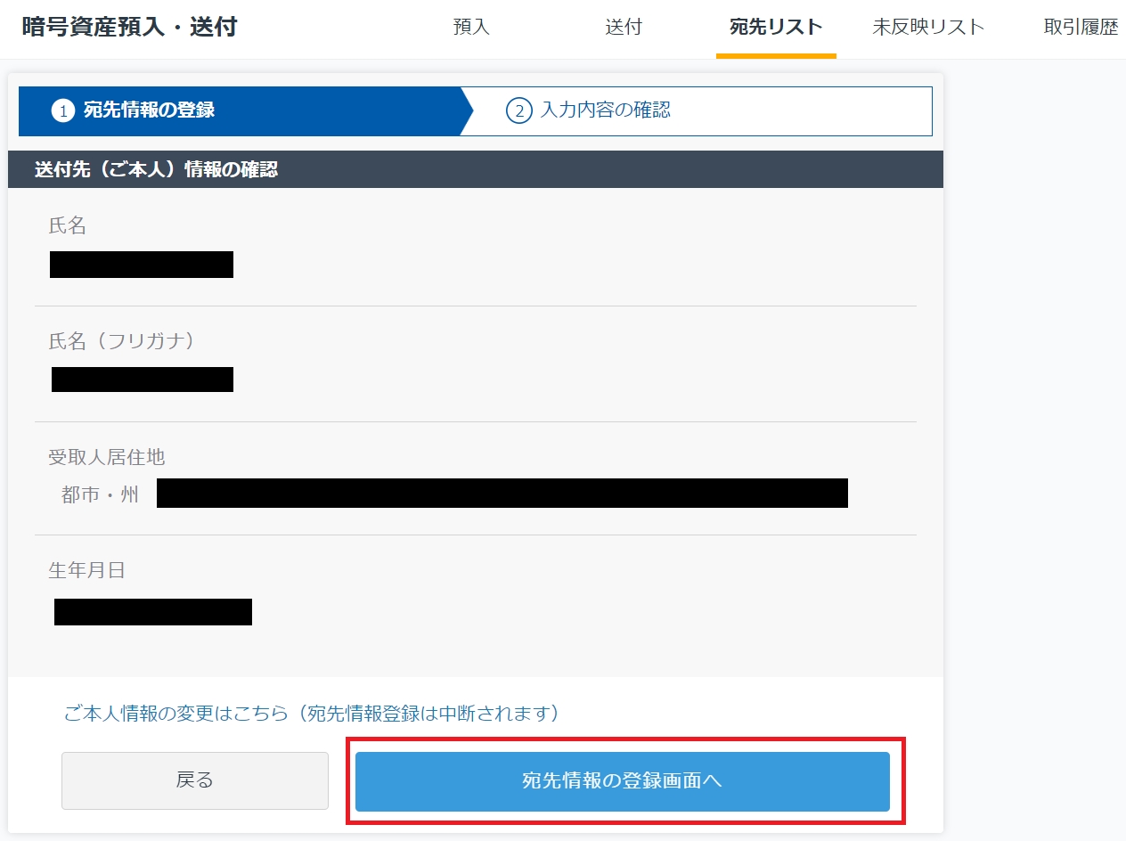 ▼宛先の情報確認がありますので、問題なければ「宛先情報の登録画面へ」をクリックします。